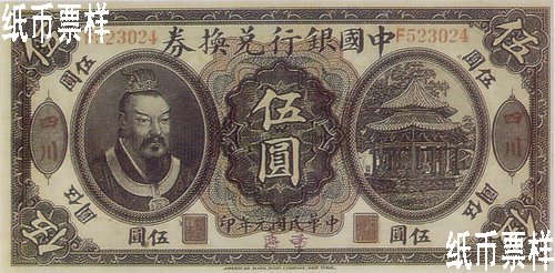 中國銀行于1912年續(xù)李鴻章像兌換券發(fā)行后,還發(fā)行了由美國鈔票公司印制的黃帝像壹圓、伍圓、拾圓三種兌換券,由各地陸續(xù)發(fā)行。