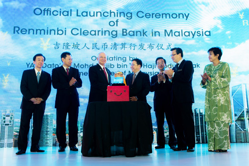 4月14日,中國(guó)銀行在馬來西亞舉行"吉隆坡人民幣清算行服務(wù)啟動(dòng)儀式"。馬來西亞總理納吉布,中國(guó)銀行行長(zhǎng)陳四清、中國(guó)駐馬來西亞大使黃惠康分別在啟動(dòng)儀式上致辭,并為"中國(guó)銀行吉隆坡人民幣清算行"揭牌。馬來西亞財(cái)政部、馬來西亞國(guó)家銀行、馬來西亞證監(jiān)會(huì)、馬來西亞證券交易所、馬來西亞主要商業(yè)銀行和世界500強(qiáng)等逾200名代表參加。