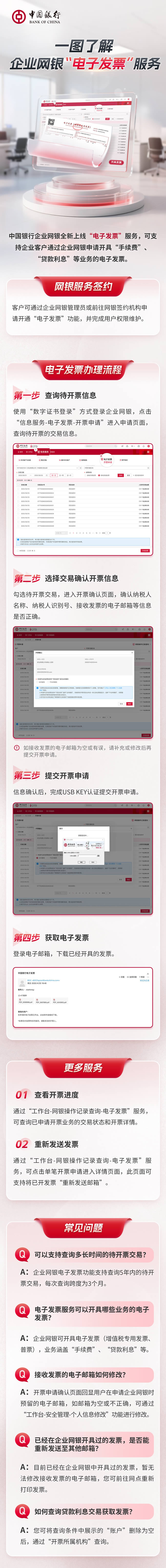 A:企業(yè)網(wǎng)銀可開具電子發(fā)票(增值稅專用發(fā)票、普票),業(yè)務(wù)涵蓋“手續(xù)費”、“貸款利息”等。