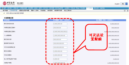您通過“交易限額設(shè)置”設(shè)定的限額不能超過中國(guó)銀行規(guī)定的最大交易限額。