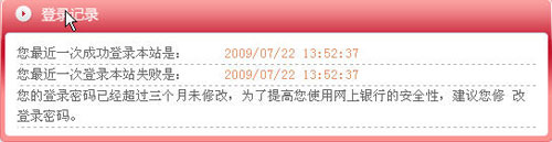 客戶登錄網(wǎng)銀、手機(jī)銀行后,歡迎頁(yè)面將顯示上次“登錄記錄”,包括最近一次成功登錄、最近一次登錄失敗的時(shí)間信息等,便于您核對(duì)實(shí)際登錄情況,如發(fā)現(xiàn)異??杉皶r(shí)采取措施。