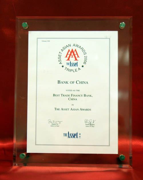 In a 2006 issue of the Asset, Bank of China was named as the "Best Trade Finance Bank, China".