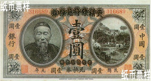 After its establishment, Bank of China as the central bank began to issue banknotes. Before the new banknotes were printed, the Li Hongzhang redeemable notes in one yuan, five yuan and ten yuan issued by Bank of Great Qing had been used for temporary circulation with additional characters of "The 1st year of the Republic of China", "Redeemable Notes of Bank of China", place name and signature printed on the notes. Originally, the one-yuan note was circulated universally without place names until stabilizing measures were taken for the imbalanced market caused by profit-seeking transfer of large amount of the note to Shanghai and Hankou for encashment.