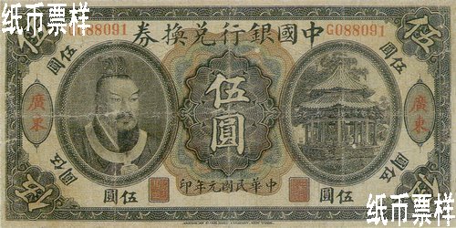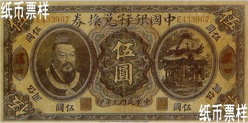 The portrait of Emperor Huang Di printed on the left of the front side and the picture of octagonal pavilion with double-hipped roof on the right; the landscape of bridge and trees printed on the back |