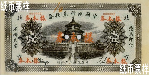 The Republic of China- Beijing Notes (1913) In 1913, Bureau of the Engraving and Printing of Ministry of Finance printed one-yuan Beijing note, with the Hall of Prayer for Good Harvest and the place name of Beijing printed on the front. However, this note was never issued.