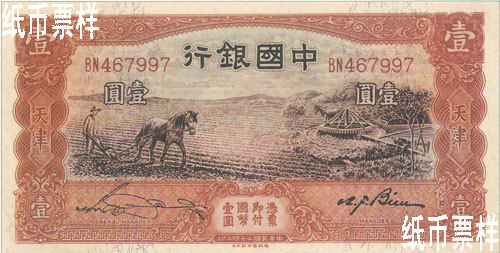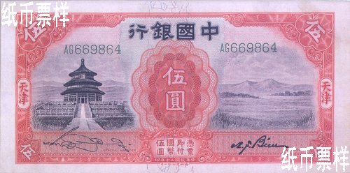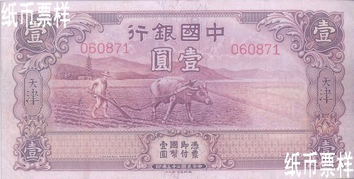 Bank of China issued a five-yuan national currency note of Tianjin in 1931, a ten-yuan one in 1934 and a one-yuan one in 1935, which were printed by Thomas De la Rue & Co., Ltd. The national currency notes of Tianjin with the domination of one yuan were issued in 1935, which were printed by Thomas De la Rue & Co., Ltd. A one-yuan national currency note with a farmer and cattle pattern printed by Thomas De la Rue & Co., Ltd. in 1934 was not issued for certain reason.