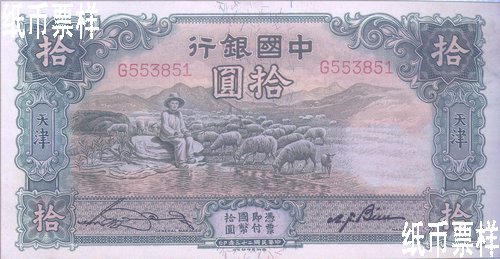 National currency note 10 yuan Tianjin A picture of a shepherd with sheep printed on the front; the Great Wall printed in the center of the back; the Heralding Spring Pavilion in Summer Palace of Beijing on the right Dark green on both sides 92×175 Thomas De la Rue & Co., Ltd. "The twenty-third year of Republic of China" printed on the front, and "OCTOBER 1934" on the back