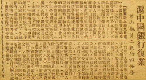 Following Shanghai's liberation on May 27, 1949, Shanghai Military Control Committee dispatched delegates to take over Bank of China head office on 28th.