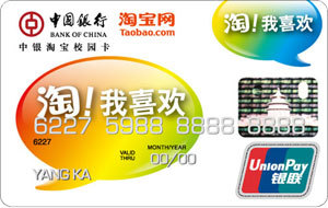 Bank of China Taobao Campus card is a UnionPay RMB card under international standards without overdraft function. Bank of China Taobao Campus card provides the core functions and services of Bank of China's bankcards, including shopping global UnionPay network partners, deposits, withdrawals, transfers and inquiries at ATMs, online banking services, optional shopping with password, SMS notice of transactions, zero risk of loss reporting, large-sum transaction confirmation and preferential merchants.