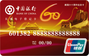 Bank of China launched Great Wall Commemorative Debit Card for the 60th Anniversary of the People's Republic of China on the occasion of the 60th anniversary of the People's Republic of China. Characterized by fashion, magnificence and vitality, the card consists of lined Great Wall, Marble Ornamental Column and Tiananmen Square, which signify rapid development of China during the past 60 years.