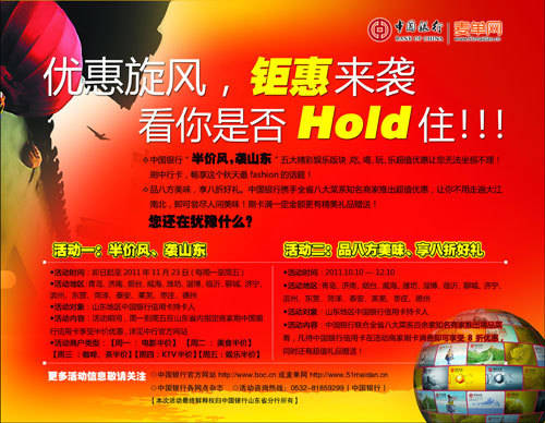 During the activity, customers will enjoy the preference of 50% off for paying with Bank of China's credit cards at designated merchants in Shandong from Monday to Friday. Please refer to Bank of China's official website for details.