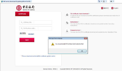 After the customer logs in to the homepage, the prompt of installing the Certificate Update ActiveX will be displayed, as shown below: