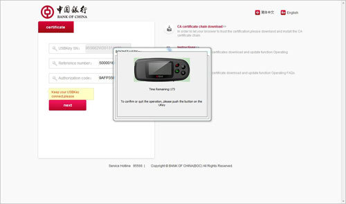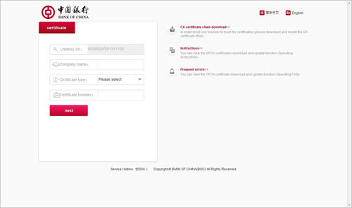 Solution: Re-enter the USBKey serial number, which should be a 16-digit combination of numbers and letters and start with 95566.
