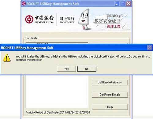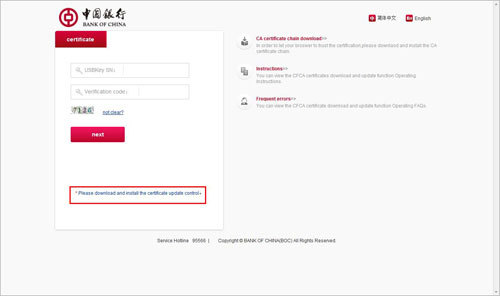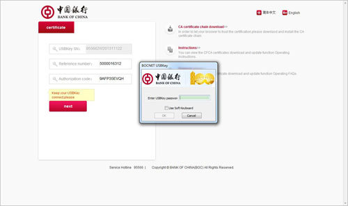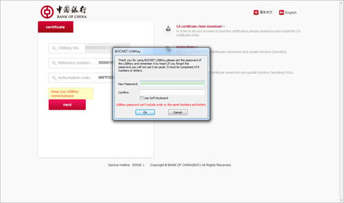 The customer forgets the USBKey password, and obtains the"Certificate Codes" through "Certificate Replacement" at our counter.