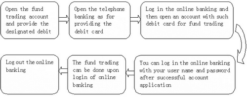1. Bank of China brings out an online fund trading system to provide our customers with a variety of and convenient fund management services. Through this new trading method, you may trade fund at home and enjoy the quality service provided by Bank of China. At present, the system could provide you with the following services: fund purchase, fund subscription, fund redemption, set up/cancel automatic re-investment, fund code inquiry, net assets value of investment funds inquiry, investment funds account balance inquiry, fund trading details inquiry and balance inquiry of investment funds account. The process is as follows: